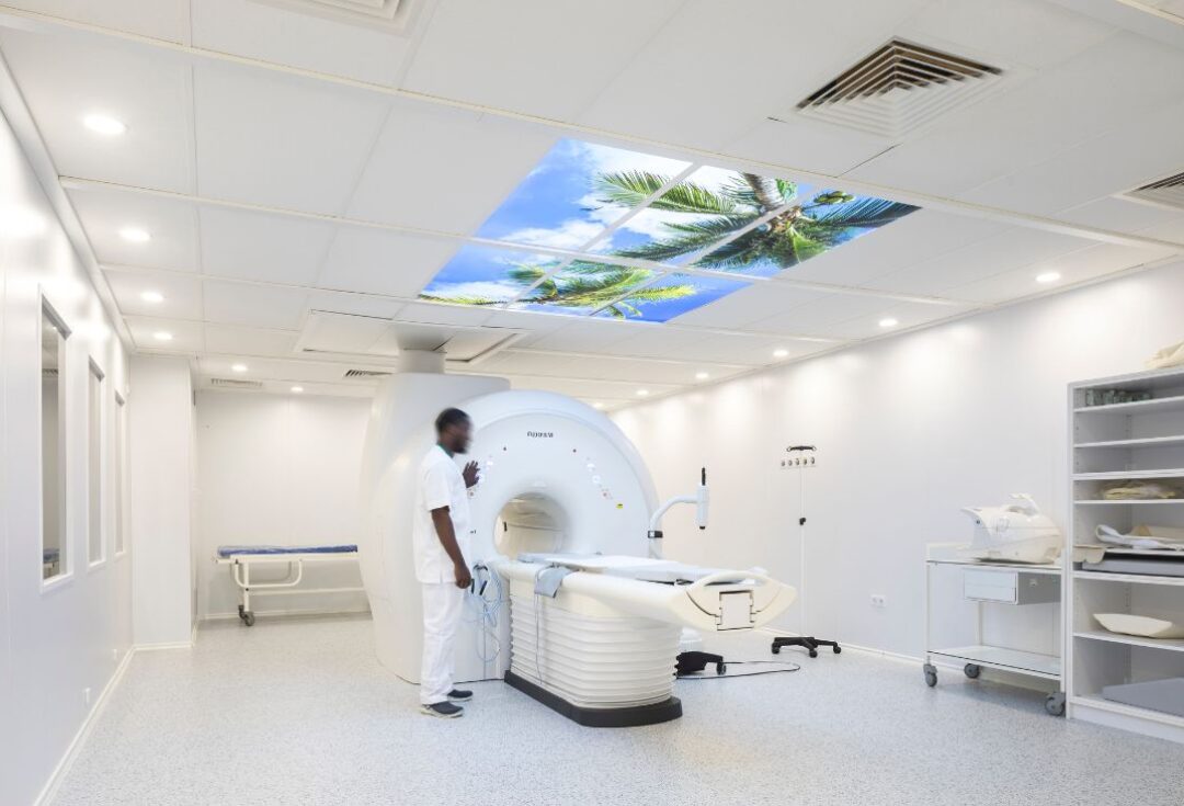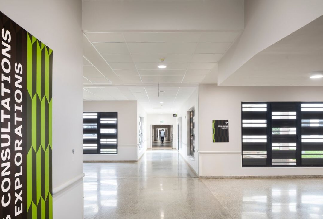 Spanning 48,000 m² over two levels, the hospital includes 434 beds and offers a wide range of specialised medical services: emergency care, intensive care, radiology, radiotherapy, chemotherapy, dialysis, neurology, and nine high-tech operating theatres certified to ISO 5 and ISO 7 standards.